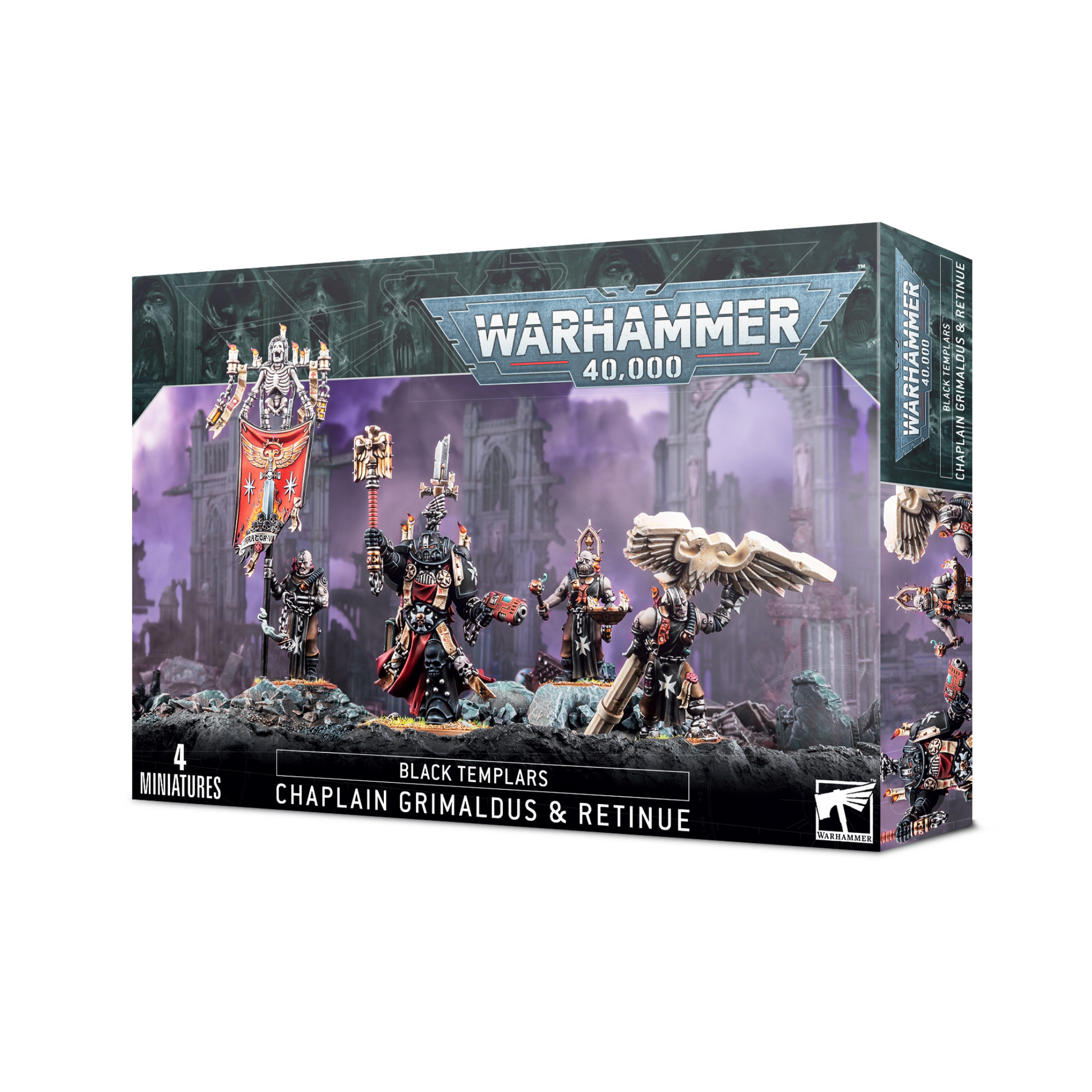 The kit is comprised of 40 plastic components, with which you can assemble one Chaplain Grimaldus and his three Cenobyte Servitors, and is supplied with one Citadel 40mm round base and three Citadel 28mm round bases. These miniatures are supplied unpainted and require assembly – we recommend using Citadel Plastic Glue and Citadel paints.