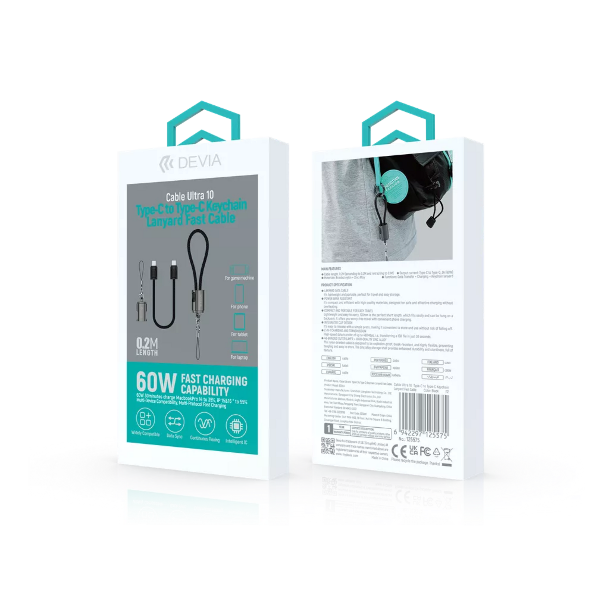 Devia - 0.2m (60W) Keychain Lanyard Woven Braided Power Delivery - USB-C to USB-C Cable - Black