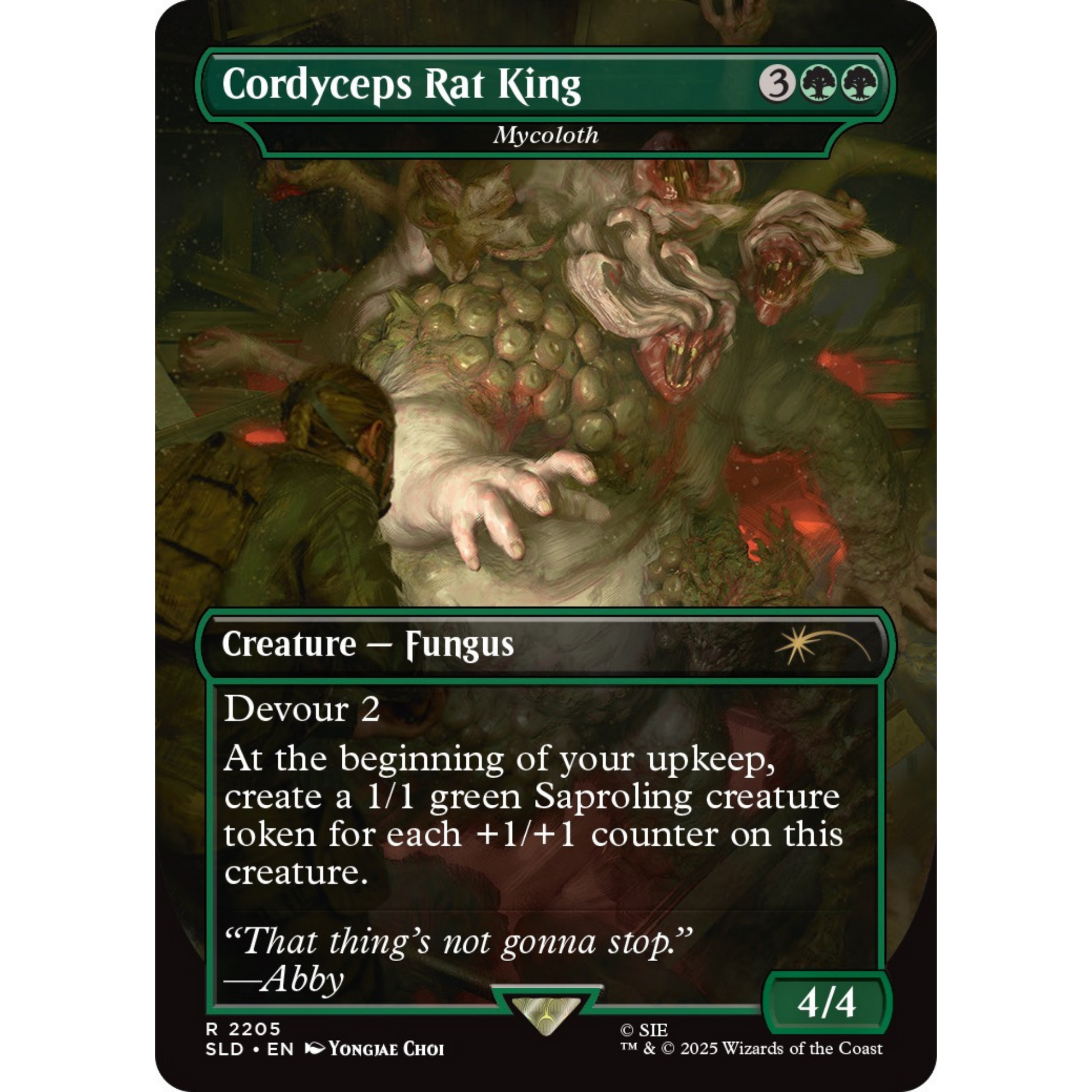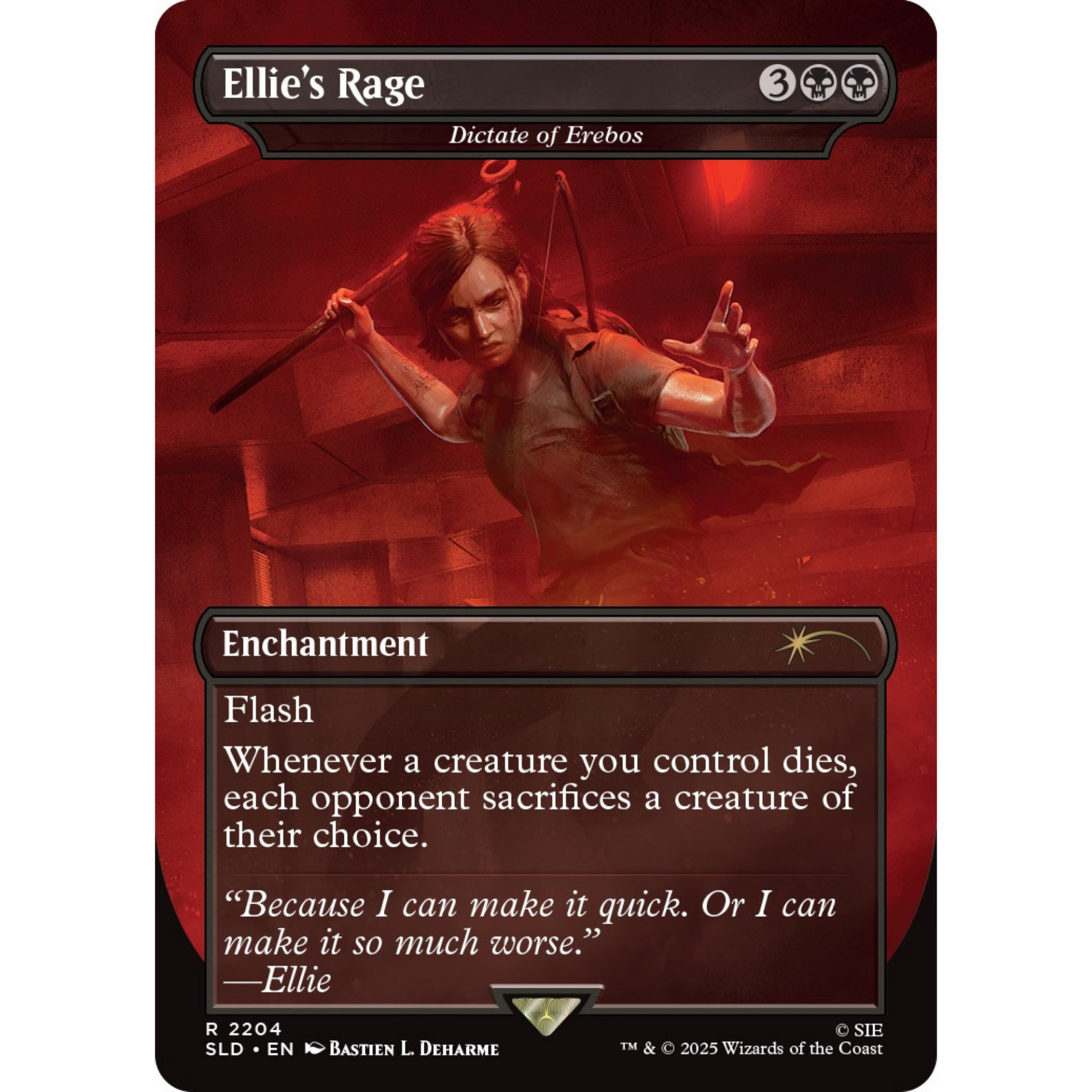The highly anticipated sequel to The Last of Us brought fans back to a world forever changed by the Cordyceps infection, and beloved characters four years later. This Secret Lair drop contains two survivors bound by bloodshed, with new cards designed for Ellie and Abby that explore the concept of revenge and perspective. Plus, keep your sacrificial fodder high with Mycoloth as "Cordyceps Rat King," then really make your opponent pay the price for sacrifice with Dictate of Erebos as "Ellie's Rage." (And of course, the obligatory Cordyceps Infected token that can be the target of an errant brick.)